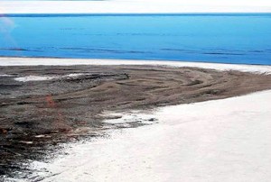 Features of Lake Eyre. Hughes Island in foreground with water travelling down the Warburton Groove past it. Aerial Photo: Trevor Wright 19/03/2010