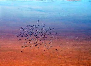 Pelicans flock in to greet the flood water spilling into Lake Eyre north. Aerial photo: Trevor Wright 18th March 2010