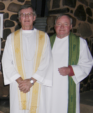 Fr Paul Bourke and Fr Chris O'Neil outside the Coober Pedy Underground Catholic Church