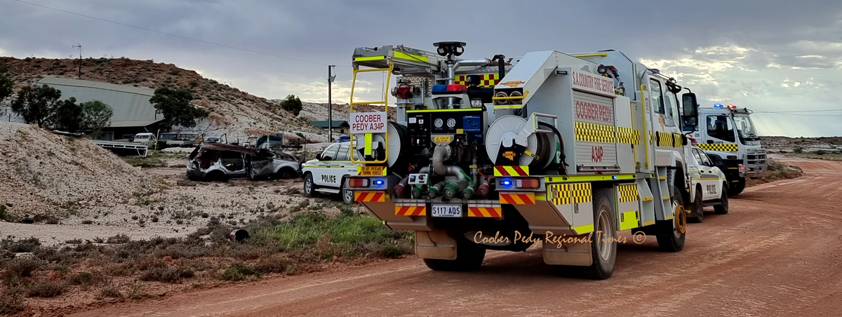 Sunday 14 January 2024 18:34:29 The Coober Pedy Police and Coober Pedy CFS with two CFS appliances responded to a report that there was a “car on fire, being towed upside down” out towards Hopeful Hills at Coober Pedy.