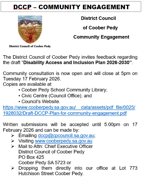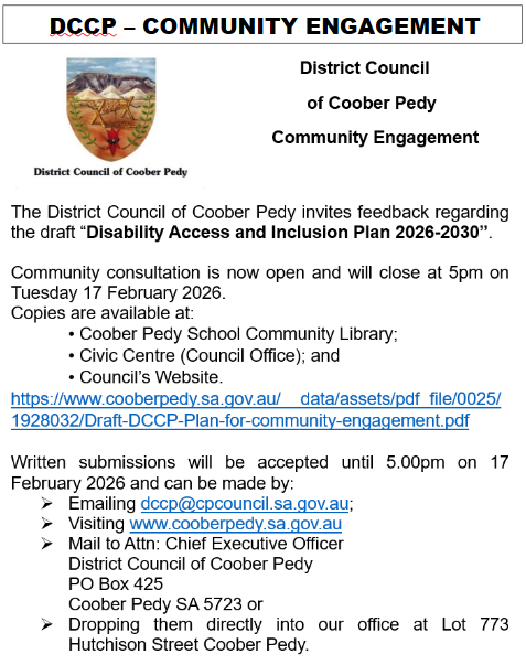 The District Council of Coober Pedy invites you to “Have Your Say” on the draft Coober Pedy Disability Access and Inclusion Plan 2026-2030